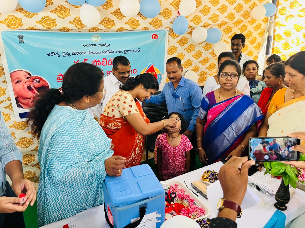 హైదరాబాద్, రంగారెడ్డి, మేడ్చల్, సంగారెడ్డి, హన్మకొండ మరియు వరంగల్ జిల్లా పరిధిలోని పట్టణ ప్రాంతంలో ఆరోగ్యశాఖ ఆదివారం పల్స్ పోలియో వ్యాక్సినేషన్ స్పెషల్ డ్రైవ్ నిర్వహించింది. ఈ 6 జిల్లాల పరిధిలో 0-5 సంవత్సరాల వయసు పిల్లలు 17,56,789 మంది ఉన్నట్టు అధికారులు అంచనా వేశారు. ఇందులో 16,35,432 మంది పిల్లలలు ఆదివారం పోలియో డ్రాప్స్ వేశామని హెల్త్ అండ్ ఫ్యామిలీ వెల్ఫేర్ కమిషనర్, డాక్టర్ సంగీత సత్యనారాయణ ప్రకటించారు. మిగిలిన పిల్లలకు కూడా పోలియో డ్రాప్స్ వేయించాలని తల్లిదండ్రులకు సంగీత విజ్ఞప్తి చేశారు. ఆరోగ్యశాఖ సిబ్బంది సోమ, మంగళవారం ఇంటింటికి తిరిగి, ఆదివారం వ్యాక్సిన్ వేయించుకోని పిల్లలకు వ్యాక్సిన్ వేస్తారని ఆమె తెలిపారు. ఈ అవకాశాన్ని పిల్లల తల్లిదండ్రులు వినియోగించుకోవాలని ఆమె కోరారు.