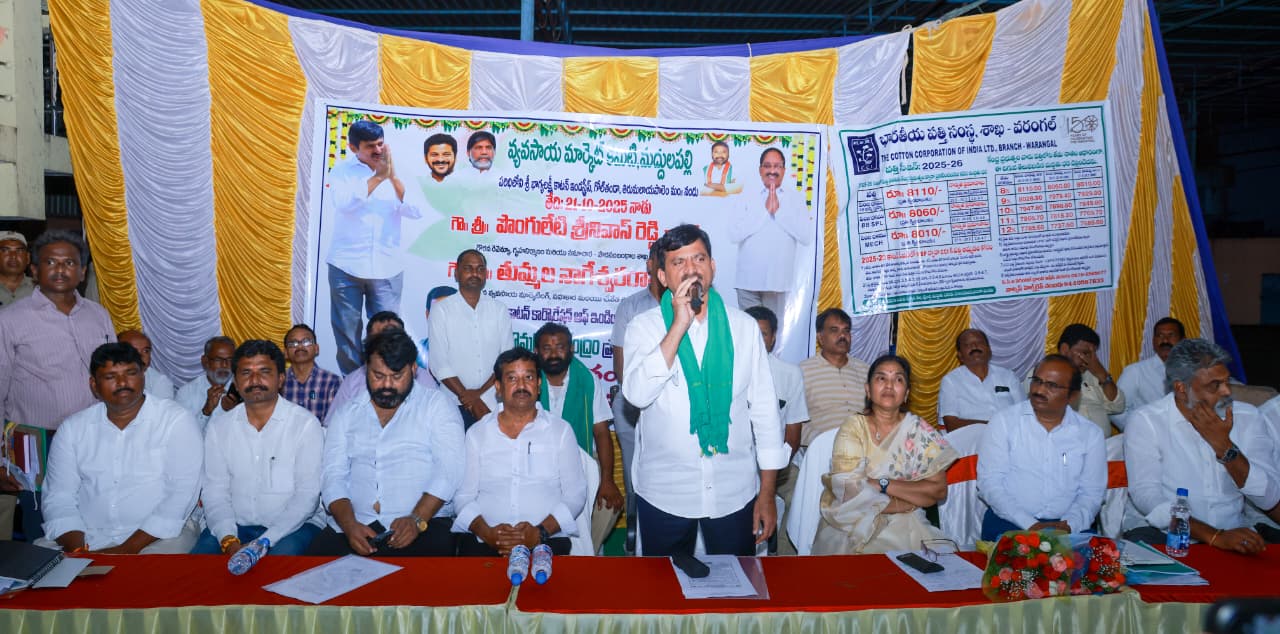 తిరుమలాయపాలెం : భారీ వర్షాల కారణంగా తీవ్రంగా నష్టపోయిన పత్తి రైతులను ఆదుకునేందుకు రాష్ట్ర ప్రభుత్వం పటిష్ట కార్యాచరణను అమలు చేస్తుందని తెలంగాణ రెవెన్యూ, గృహ నిర్మాణం, సమాచార శాఖల మంత్రి పొంగులేటి శ్రీనివాస్ రెడ్డి స్పష్టం చేశారు. తేమ శాతం పేరుతోగానీ, తరుగు పేరిట గానీ రైతులను అనవసరంగా ఇబ్బందులు పెట్టి మద్దతు ధరలో కోత విధిస్తే ఎట్టి పరిస్థితుల్లోనూ ఉపేక్షించేది లేదని ఆయన కాటన్ కార్పొరేషన్ ఆఫ్ ఇండియా (సీసీఐ) అధికారులను, మిల్లు యజమానులను హెచ్చరించారు.