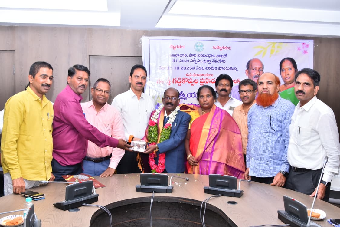 సమాచార పౌర సంబంధాల శాఖలో డిప్యూటీ డైరెక్టర్ గా ఉన్న జి ప్రసాదరావు నేడు పదవీ విరమణ చేశారు వివిధ హోదాల్లో దాదాపు 41 సంవత్సరాల సర్వీసు అనంతరం నేడు ప్రసాదరావు పదవి విరమణ కార్యక్రమాన్ని సమాచార భవన్ లో ఘనంగా నిర్వహించారు. ఖమ్మం వరంగల్ ఆదిలాబాద్ హైదరాబాద్ జిల్లాల్లో వివిధ హోదాల్లో పని చేసిన ప్రసాదా రావు సేవలను ఈ పదవీ విరమణ కార్యక్రమానికి హాజరైన సీనియర్ అధికారులు కొనియాడారు. ఈ పదవి విరమణ కార్యక్రమంలో జాయింట్ డైరెక్టర్లు డీ.ఎస్ జగన్, డి శ్రీనివాస్, కే వెంకటరమణ డిప్యూటీ డైరెక్టర్లు హాష్మి,, వై వెంకటేశ్వర్లు సురేష్, ఆర్.ఐ.ఈ జయరాం మూర్తి, తెలంగాణ మాసపత్రిక ఎడిటర్ శాస్త్రి లతోపాటు సమాచార శాఖ అధికారులు, సిబ్బంది, డిడి ప్రసాద్ కుటుంబ సభ్యులు పాల్గొన్నారు,