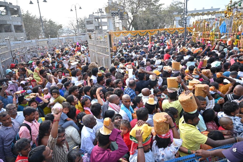 జాతర ప్రాంగణం మొత్తం భక్తులతో కిటకిటలాడుతోంది. ఎటు చూసినా భక్తులే దర్శనమిస్తున్నారు. క్రమబద్ధంగా ఏర్పాటు చేసిన క్యూ లైన్లలో భక్తుల బారులు దర్శనానికి ఎదురుచూస్తుండగా, ప్రశాంత వాతావరణంలో తల్లుల దర్శనాలు సజావుగా కొనసాగుతున్నాయి.