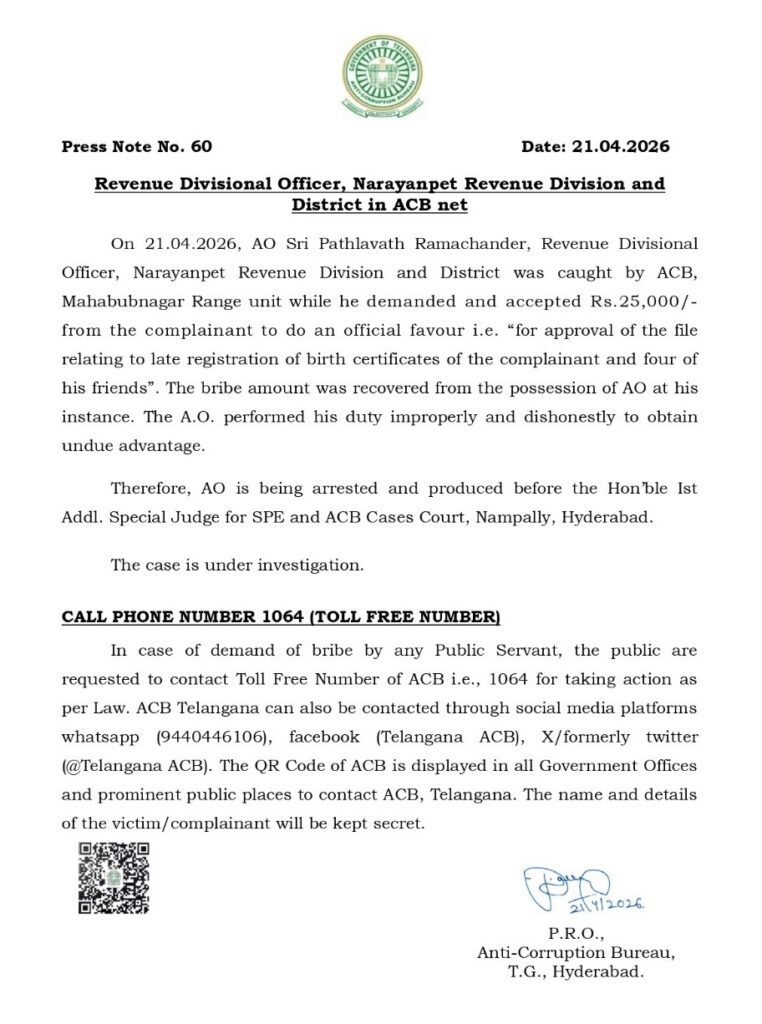 నారాయణపేట ఆర్డీవో కార్యాలయంపై ఏసీబీ అధికారులు దాడులు నిర్వహించారు. ఓ వ్యక్తి నుంచి బర్త్ సర్టిఫికెట్ల విషయంలో 25 వేల రూపాయలు లంచం తీసుకుంటుండగా ఆర్డీవో రాంచంద్ర నాయక్ను ఏసీబీ అధికారులు రెడ్హ్యాండెడ్గా పట్టుకున్నారు. ఆర్డీవో కార్యాలయంలో ఏసీబీ దాడులు ఇంకా కొనసాగుతున్నాయి. రాంచంద్రనాయక్ ఈ ఏడాది అక్టోబర్ రిటైర్మెంట్ కావాల్సి ఉంది. ప్రభుత్వ ఉద్యోగి ఎవరైనా ప్రభుత్వ ఉద్యోగ నిబంధనలకు వ్యతిరేకంగా లంచాలు డిమాండ్ చేస్తే ఏసీబీ టోల్ ఫ్రీ నంబర్ 1064కి కాల్ చేయాలని లేదా 9440446106 వాట్సాప్ నంబర్కు ఫిర్యాదు చేయాలని ఏసీబీ ఉన్నతాధికారి కోరారు.
