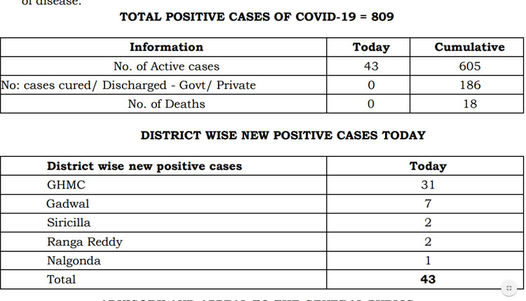 తెలంగాణ రాష్ట్ర వ్యాప్తంగా ఈ రోజు కొత్తగా 43 కేసులు నమోదయ్యాయి. తెలంగాణలో మొత్తం కేసులు 809 కాగా ప్రస్తుతం యాక్టివ్ పాజిటివ్ కేసులు 605కు చేరుకున్నాయి. ఇప్పటి వరకు ఆస్పత్రి నుంచి చికిత్స పొంది 186 మంది కరోనా బాధితులు డిశ్చార్జ్ అయ్యారు. కోవిడ్ 19 వైరస్ బారిన పడి 18 మంది మృత్యువాత పడ్డారు. ఈ రోజు గ్రేటర్ హైదరాబాద్ మున్సిపల్ కార్పోరేషన్ పరిధిలో 31 కొత్త కేసులు నమోదు కాగా, గద్వాల జోగులాంబ జిల్లాలో 7, సిరిసిల్లలో 2, రంగారెడ్డిలో 2, నల్లగొండ జిల్లాలో 1 కేసు నమోదయ్యాయి.