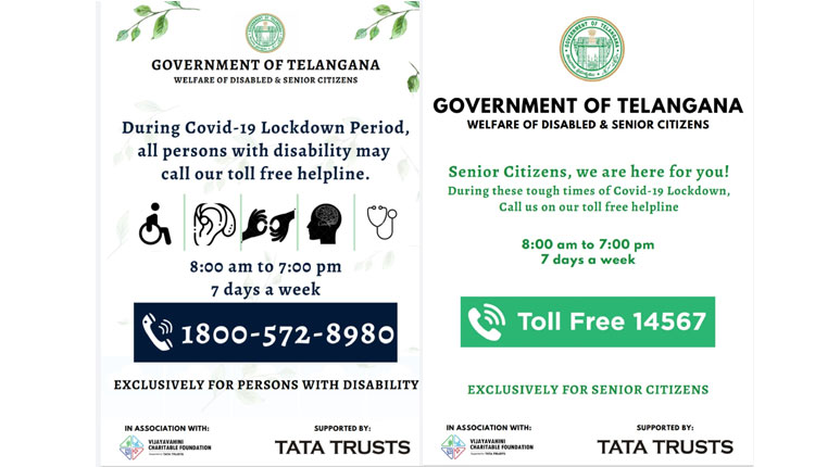 లాక్డౌన్ కాలంలో దివ్యాంగులను ఆదుకునేందుకు ప్రభుత్వం ముందుకొచ్చింది. వికలాంగులు, చెవుడు, మూగ, మానసిక సమస్యలు ఉన్న వారంతా 1800 572 8980 హెల్ప్లైన్ నంబర్కు కాల్ చేసి తమ సమస్యలను చెప్పుకొవచ్చు. ఈ హెల్ప్లైన్ నంబర్ ఉదయం 8 గంటల నుంచి రాత్రి 7 గంటల వరకు అందుబాటులో ఉంటుంది. సీనియర్ సిటిజన్లకు ప్రత్యేకంగా మరో టోల్ ఫ్రీ నెంబర్ 14567 కేటాయించారు. ఇది కూడా ఉదయం 8 నుంచి రాత్రి 7 గంటల వరకు పని చేస్తుంది.